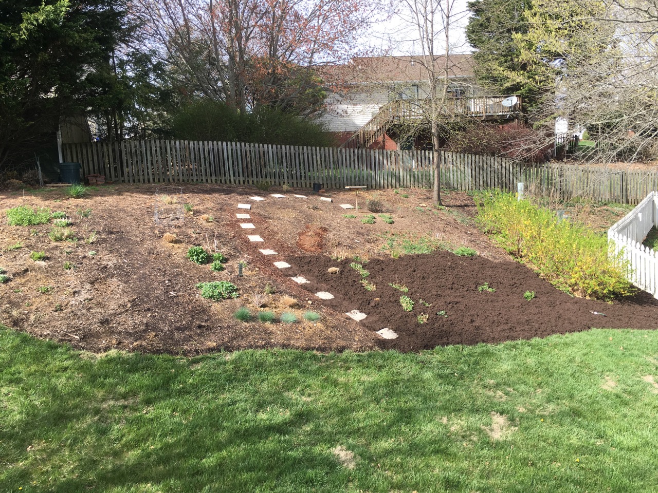 April 10: Two tons of mulch spread. And I got a spicebush!