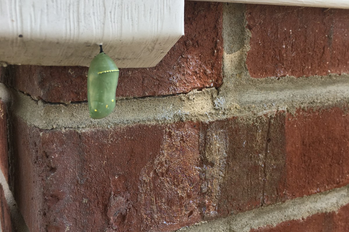 Sep 15: monarch chrysalises September 15, 2019October 27, 2019Posted in summerTagged butterfly gardening, chrysalis, monarch Two monarch chrysalises behind my reading chair Monarch caterpillar making chrysalis under Joe Pye weed leaf Swallowtail caterpillar hanging out on hyssop Fritillary Share this: Click to share on X (Opens in new window) X Click to share on Facebook (Opens in new window) Facebook Like Loading... Related