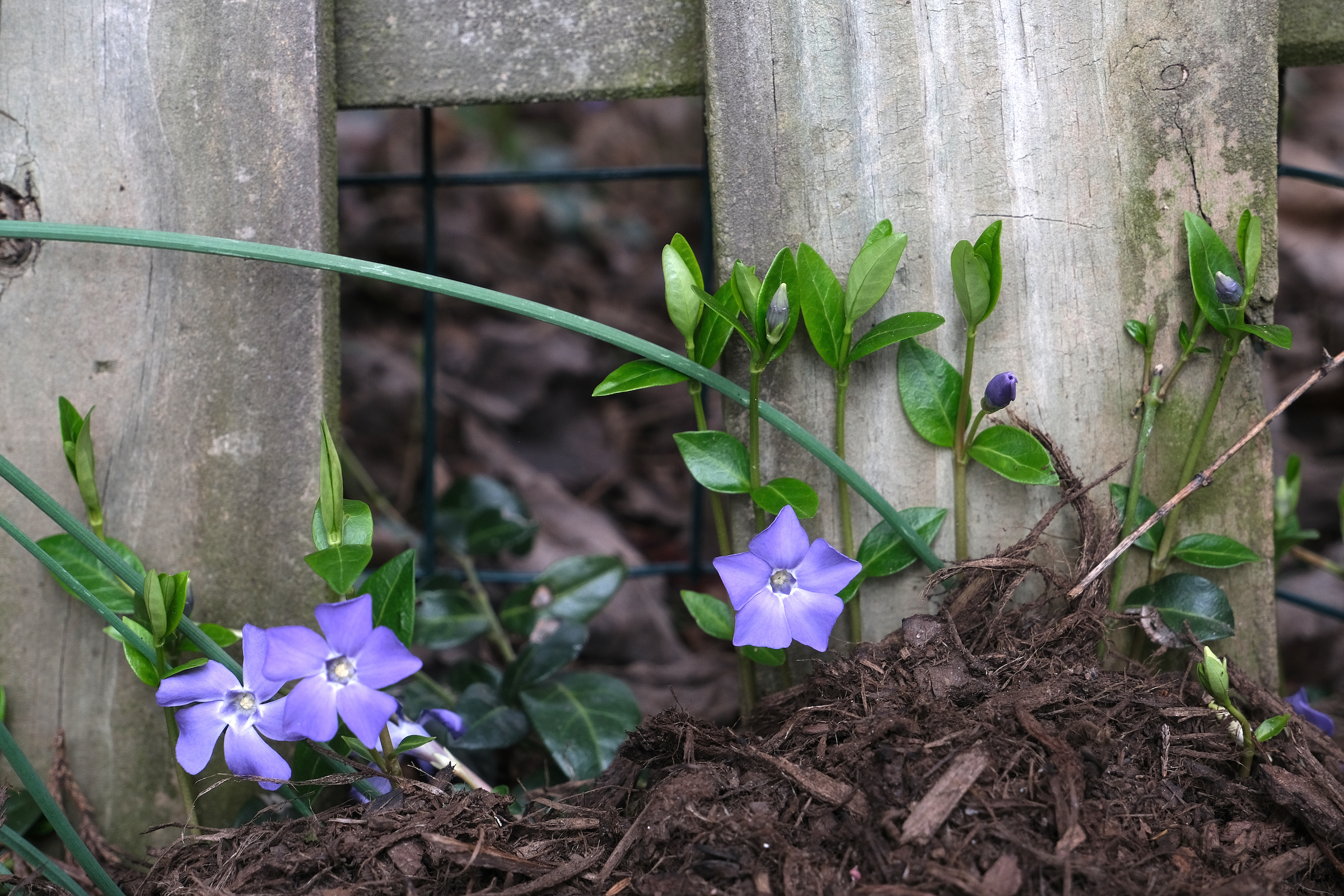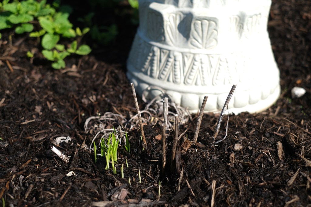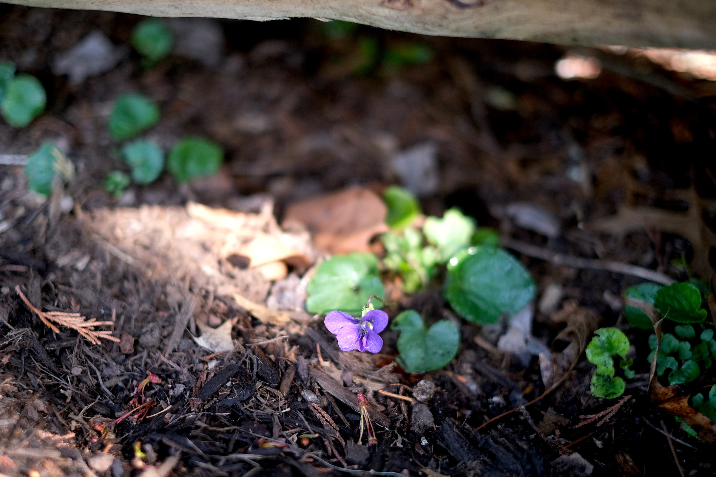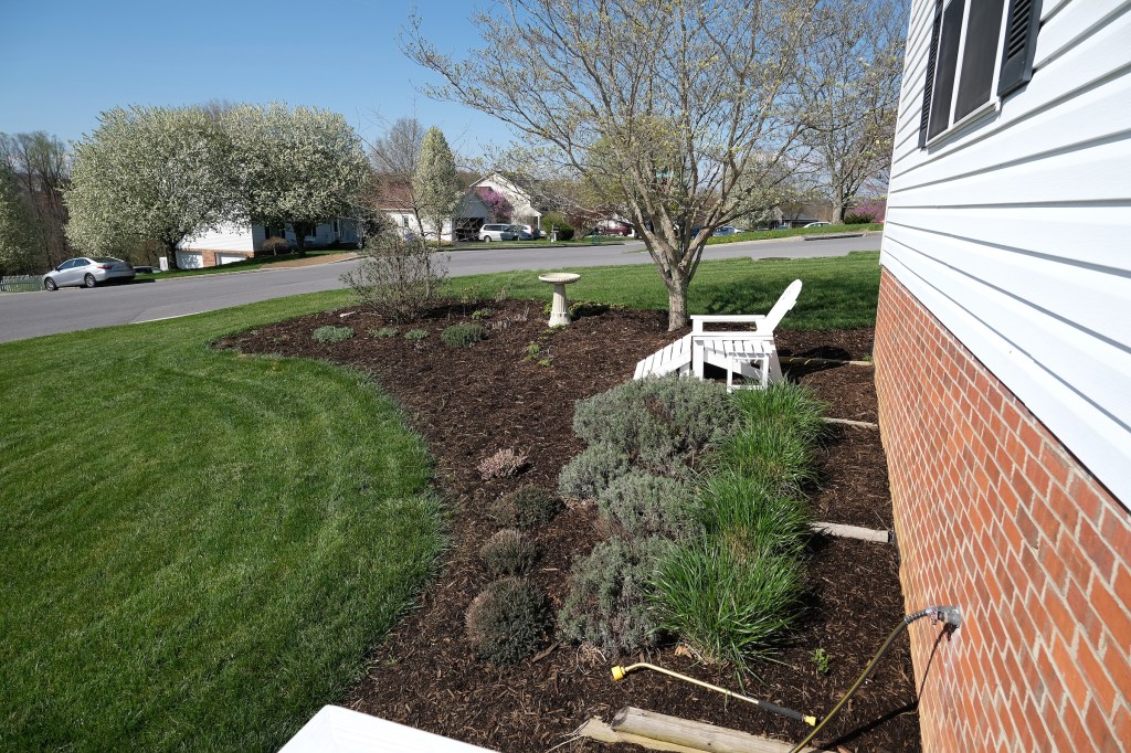 In our garden, the redbud is covered in fuchsia buds and the dogwood flowers bloom green before they brighten to white. The leaves of perennials begin to emerge from beneath the fresh mulch. The blades of ornamental grasses come in tender and emerald green. The forsythia and daffodils are done in our garden — I cut back the forsythia this weekend — but violets and periwinkles blossom at the top of the hill. The salvia forms buds that should open in a few weeks. Besides the trees, the primary flowers right now are the ones in our flower baskets; that will change soon though.