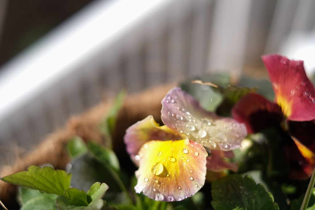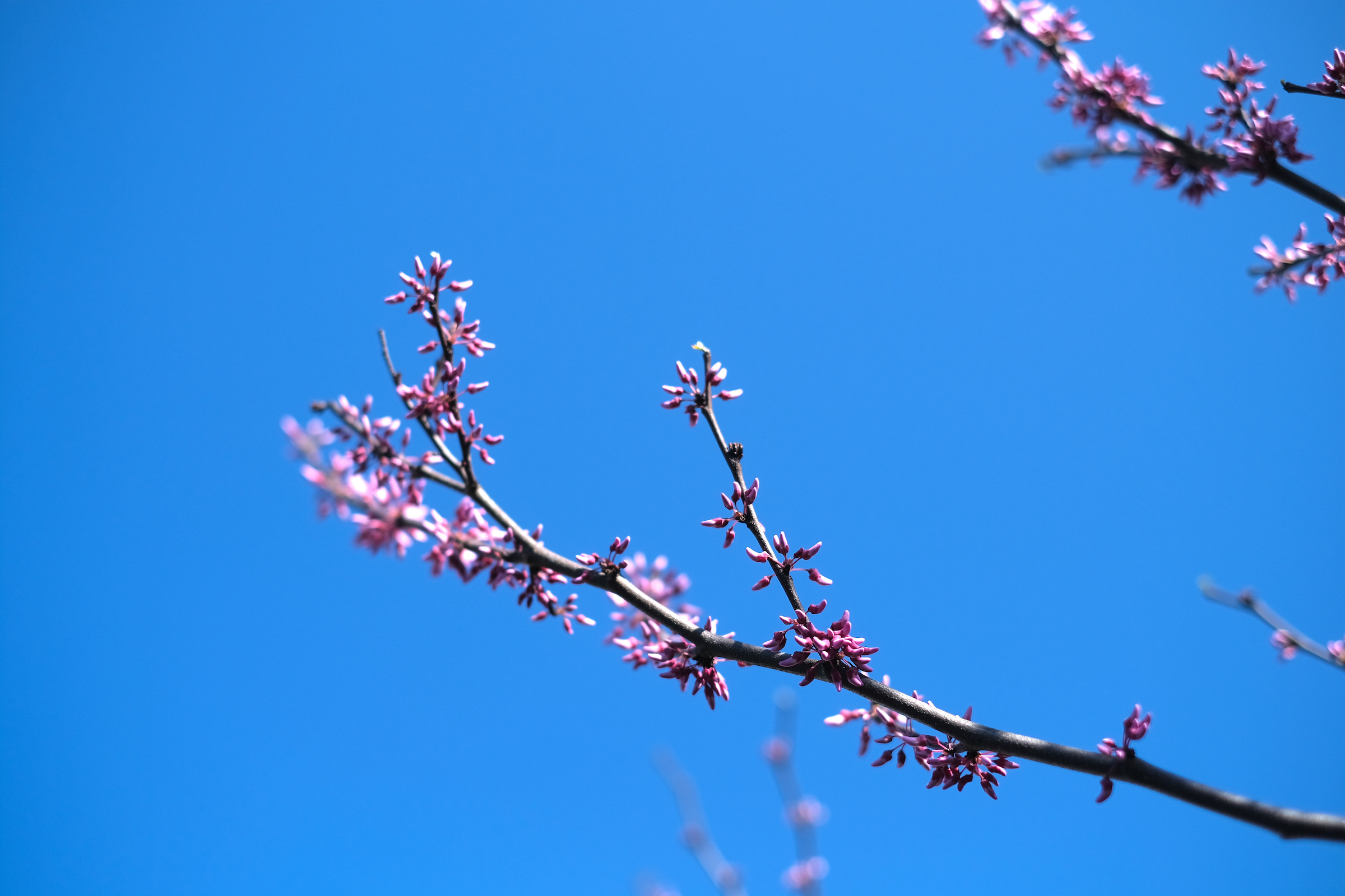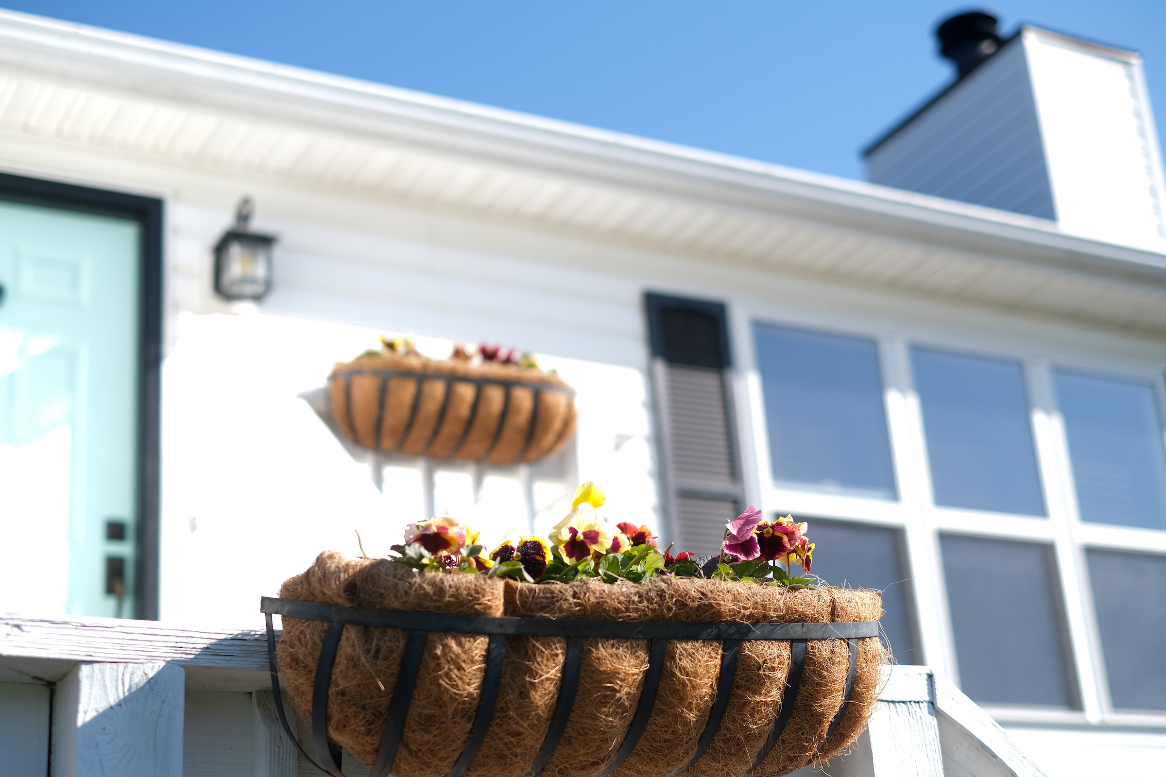 In our garden, the redbud is covered in fuchsia buds and the dogwood flowers bloom green before they brighten to white. The leaves of perennials begin to emerge from beneath the fresh mulch. The blades of ornamental grasses come in tender and emerald green. The forsythia and daffodils are done in our garden — I cut back the forsythia this weekend — but violets and periwinkles blossom at the top of the hill. The salvia forms buds that should open in a few weeks. Besides the trees, the primary flowers right now are the ones in our flower baskets; that will change soon though.