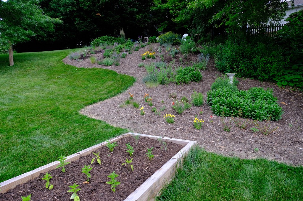 I’m still waiting for the beds to fill in — I delayed a lot of growth by moving everything around over the winter. I hope it didn’t permanently damage stuff, and I hope I have the patience this coming winter to leave everything alone so it can re-establish. Maybe things will fill in more by July and August. We’ll see. That’s one reason for posting these status updates with pictures, so I’ll have a comparison next year.