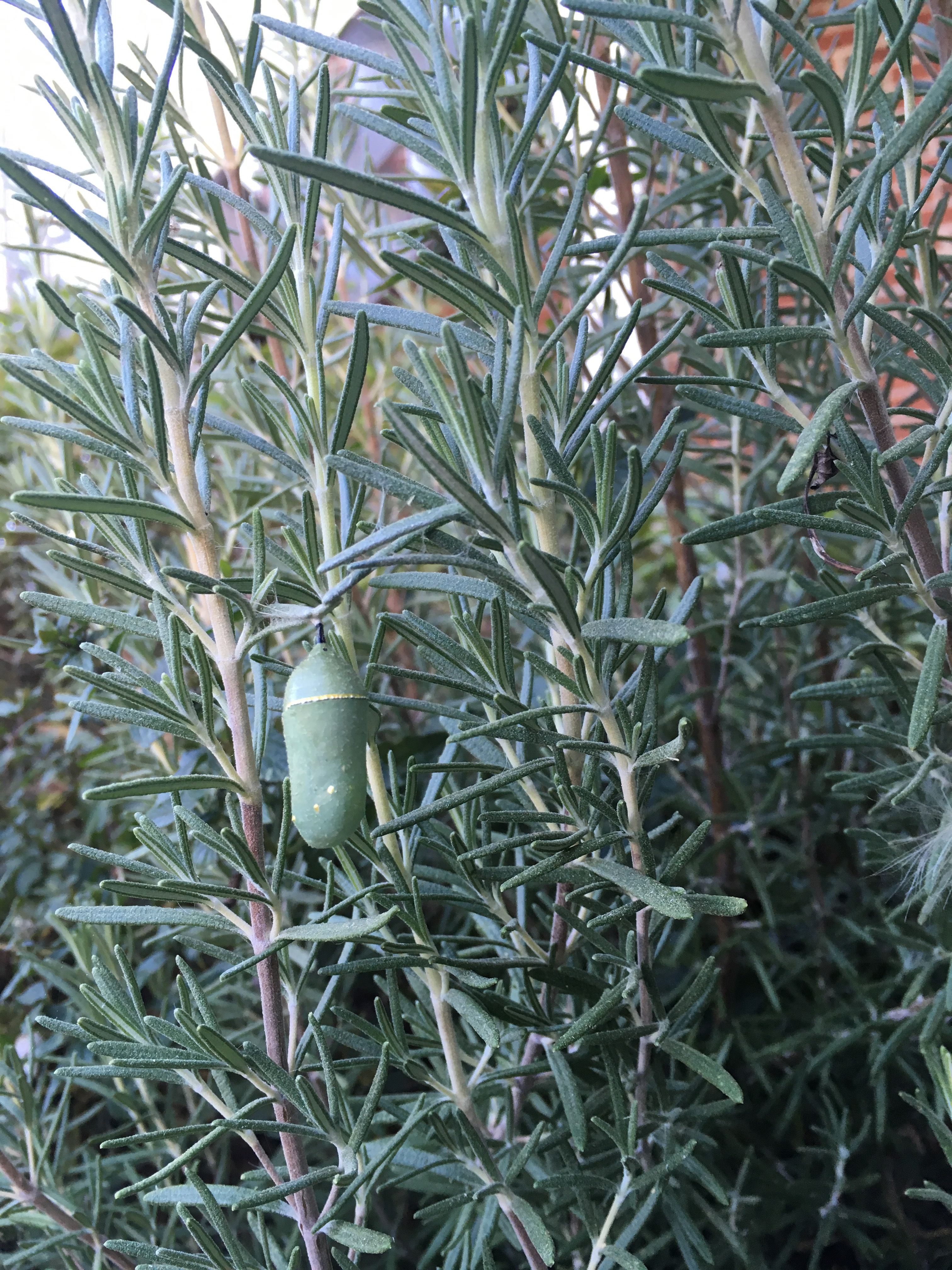 After finding those, I of course crawled around in the mulch and dirt to inspect the undersides of leaves. I found three more monarch chrysalises plus a bunch of fat swallowtail caterpillars who will soon be crawling off to metamorphasize as well.