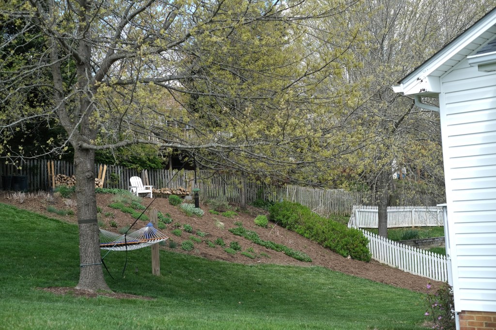 Back hill after transplanting plants from front garden. April 21, 2018
