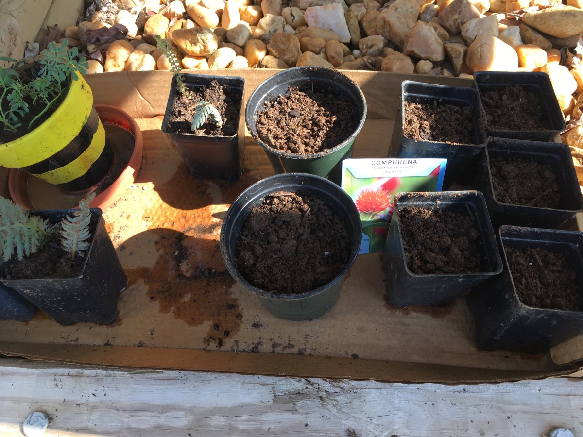 Zinnia seedlings after spacing them outNone of the globe amaranth came up, so I planted some in pots and put them with the cuttings I started last week (19 May).