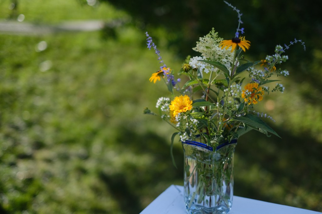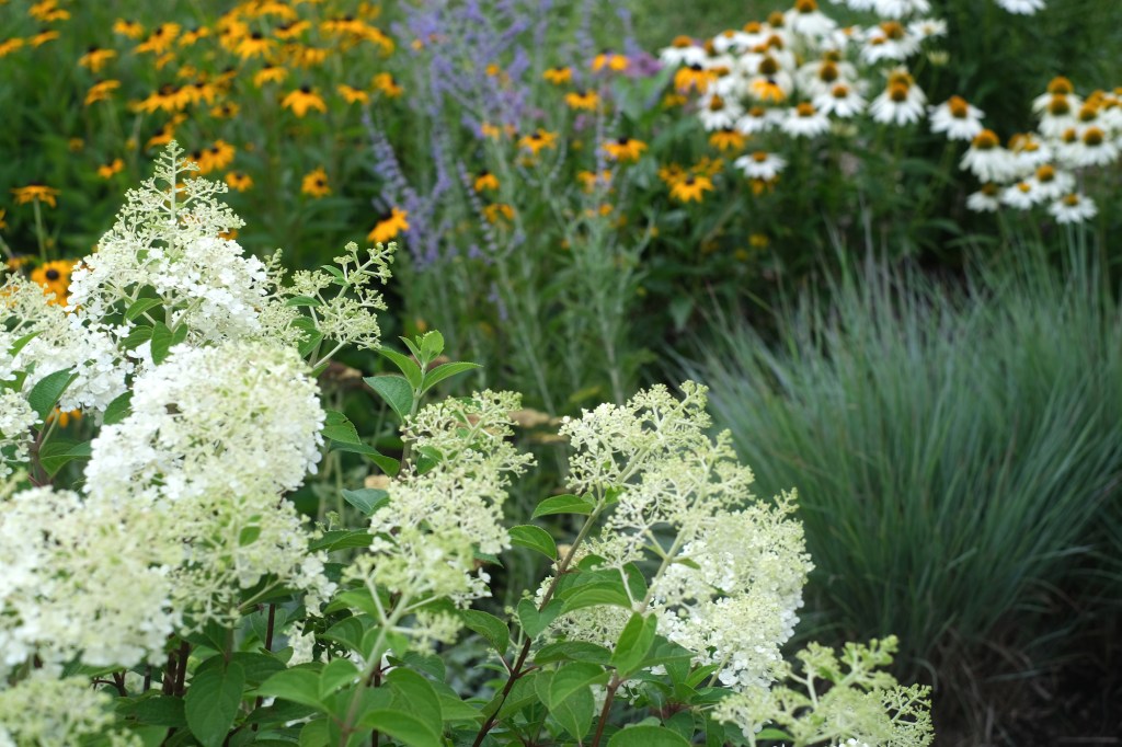 We’re in peak summer flower season: the rudbeckia, shasta daisies, echinacea, white hydrangea, Russian sage, blanket flowers, and butterfly bush are all gorgeous. The Joe Pye weed, autumn joy sedum, goldenrod, and mums are getting ready to flourish. The yarrow, roses, and salvias are done, though, and I need to cut them back to clean things up a bit.