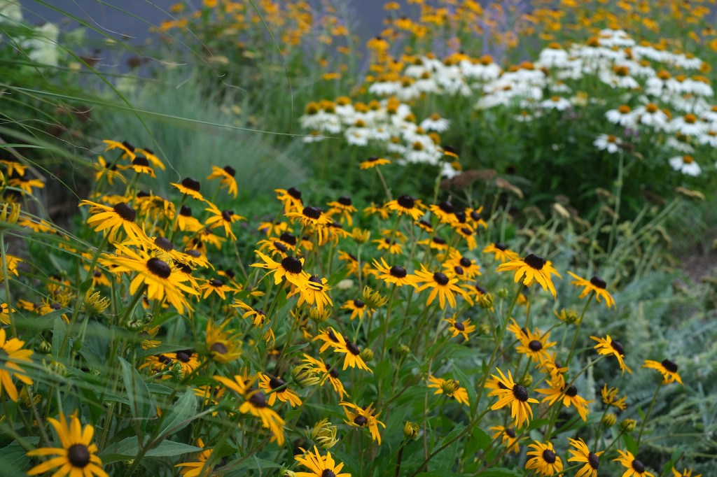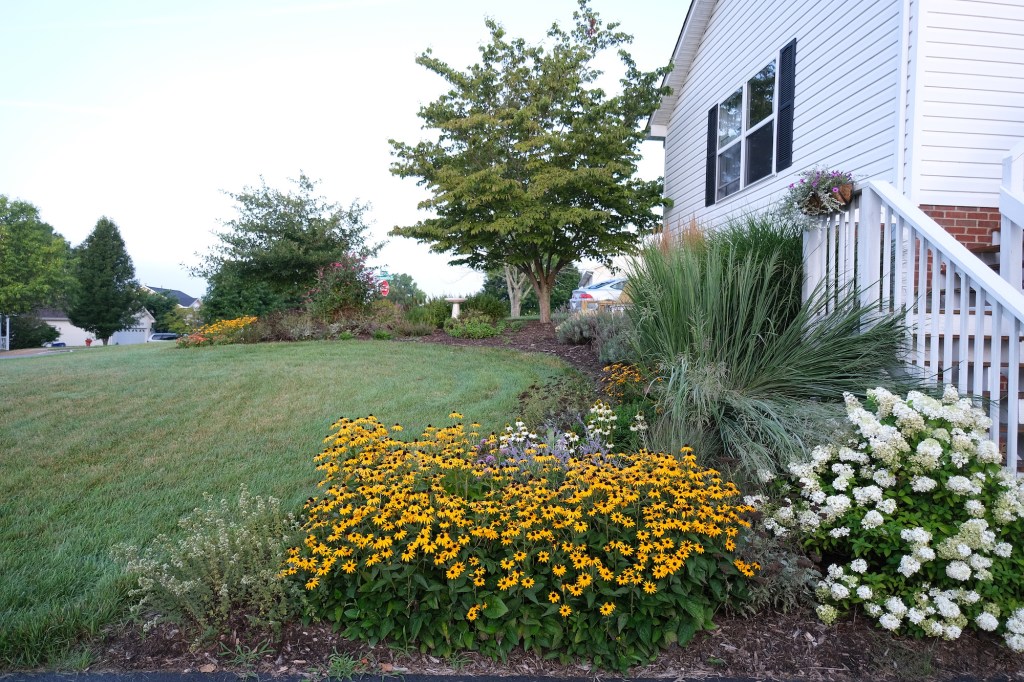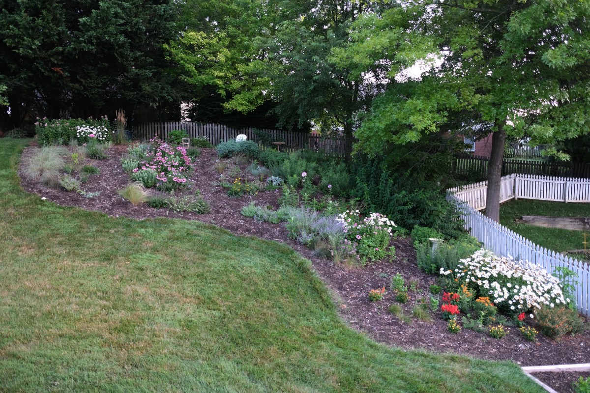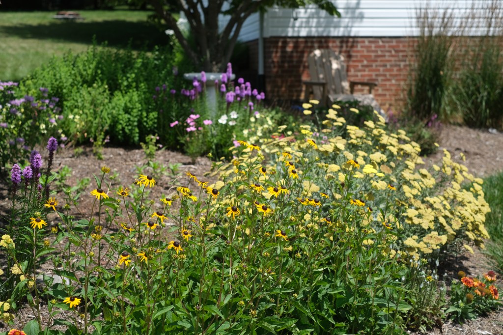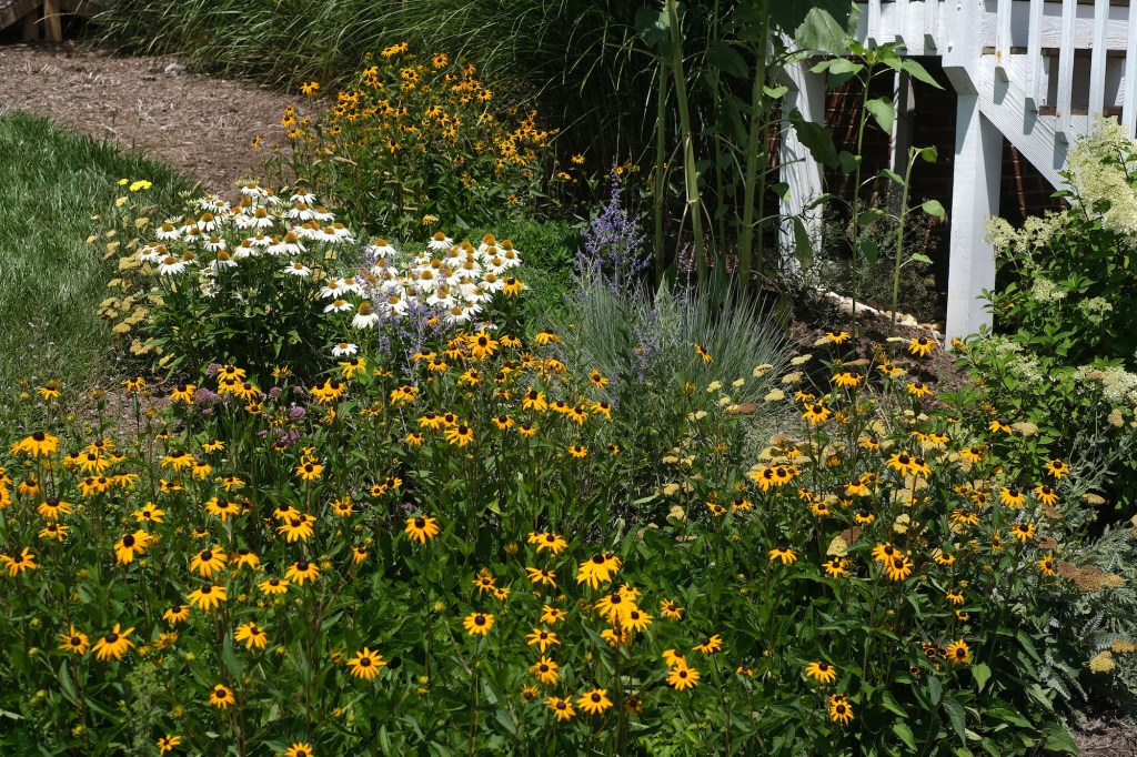 The late summer flowers are in bloom — rudbeckia, echinacea, goldenrod — and zinnias are flowering where I let their seeds fall out back last year. The lavender in front never really recovered this year; I think I’ll replace it with mums.