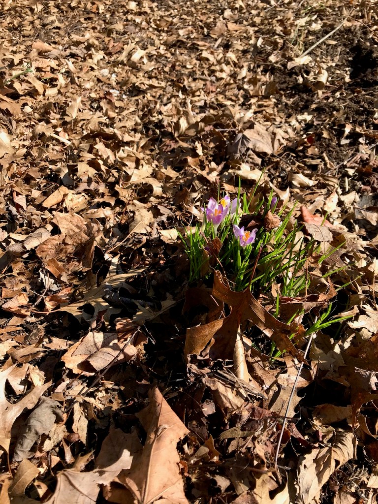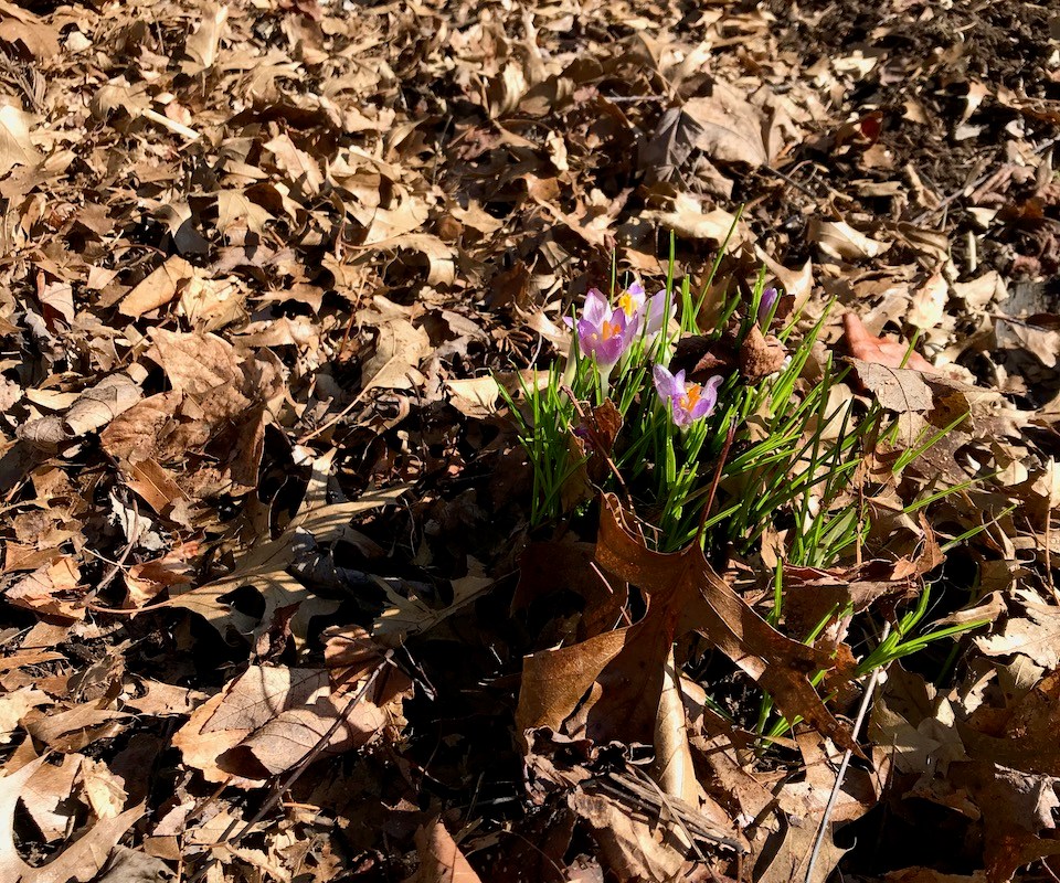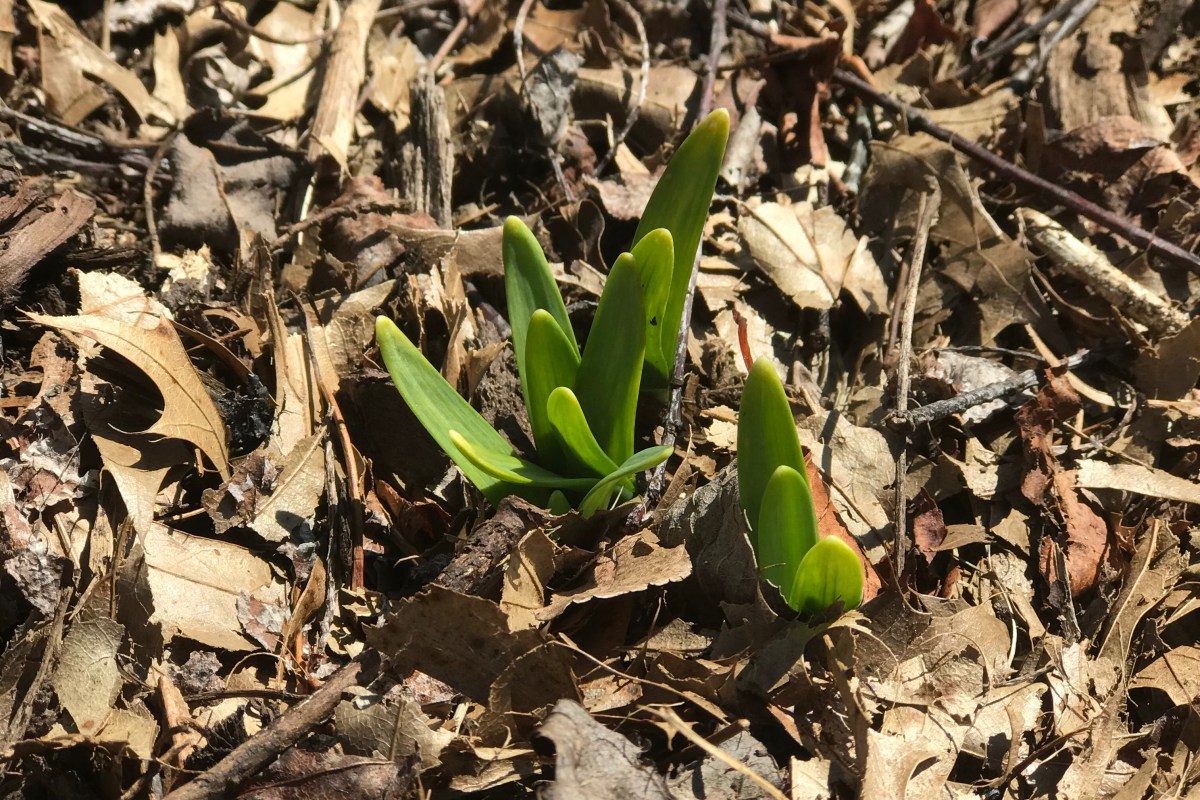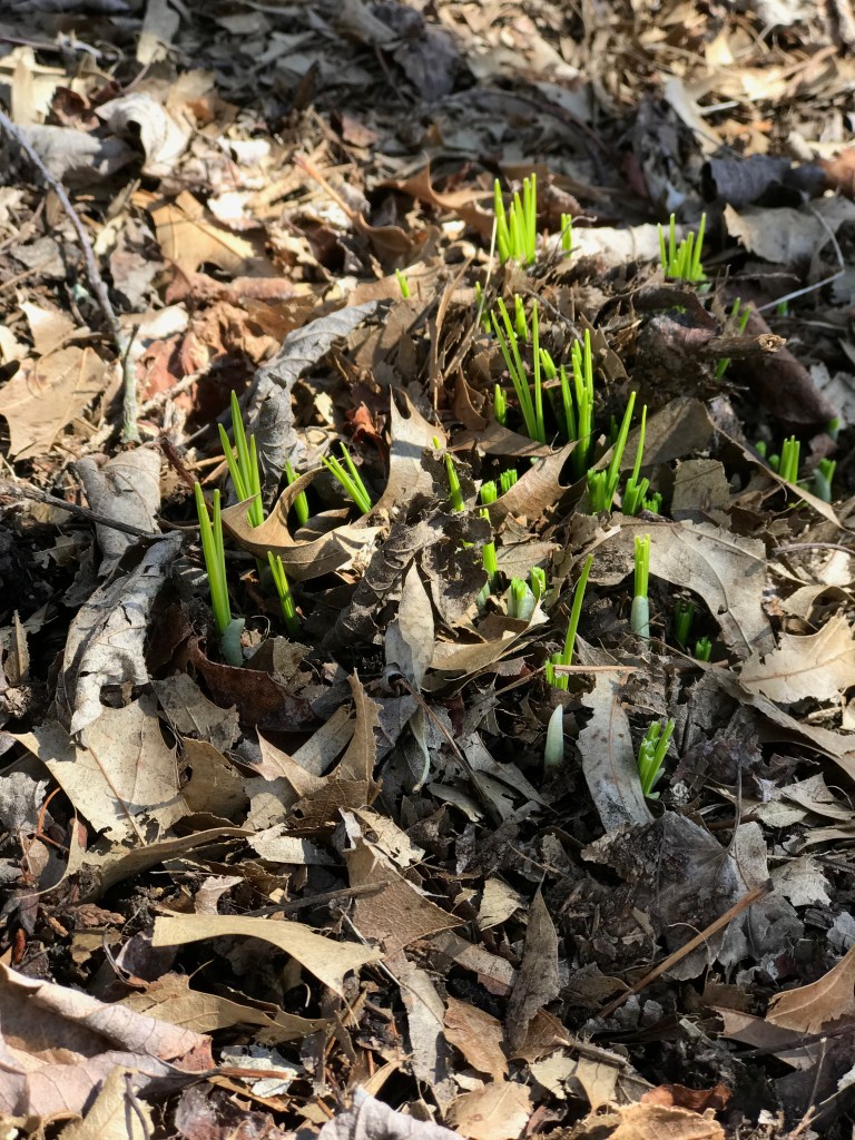 As I worked, I smelled fresh mint in the mint patch. I listened to birds chirp and leaves rustle in a warm breeze. I was surprised by the first forsythia blossom. When I pulled away dead debris and raked out leaves that have insulated the ground these last 5 months, I found leaves emerging underneath – sedum, tulips, columbine, goldenrod.