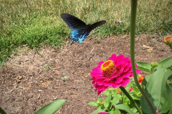 July 18: sunflower, swallowtails, and monarch caterpillar