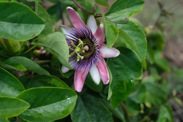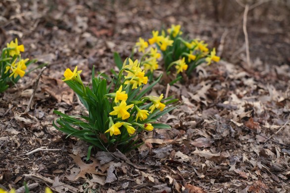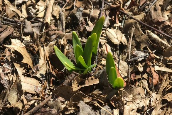 Feb 23: bees, sedum leaves, volunteer feverfew, and first vinca flower