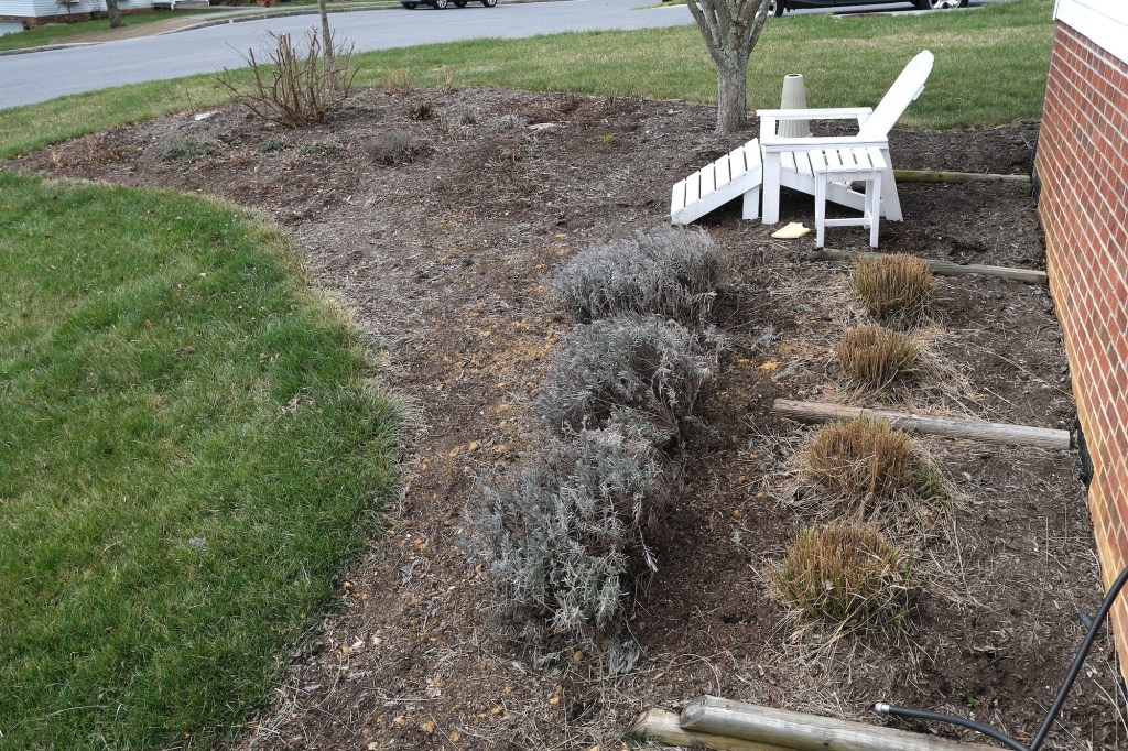 In the herb bed, our daughter planted the violas, and I trimmed the lavender. I cut all the dead flower stems from last year and pruned about a third of the plant material, cutting shoots from inside the mounds and around the edges as well. The lavender still appears to be dormant.