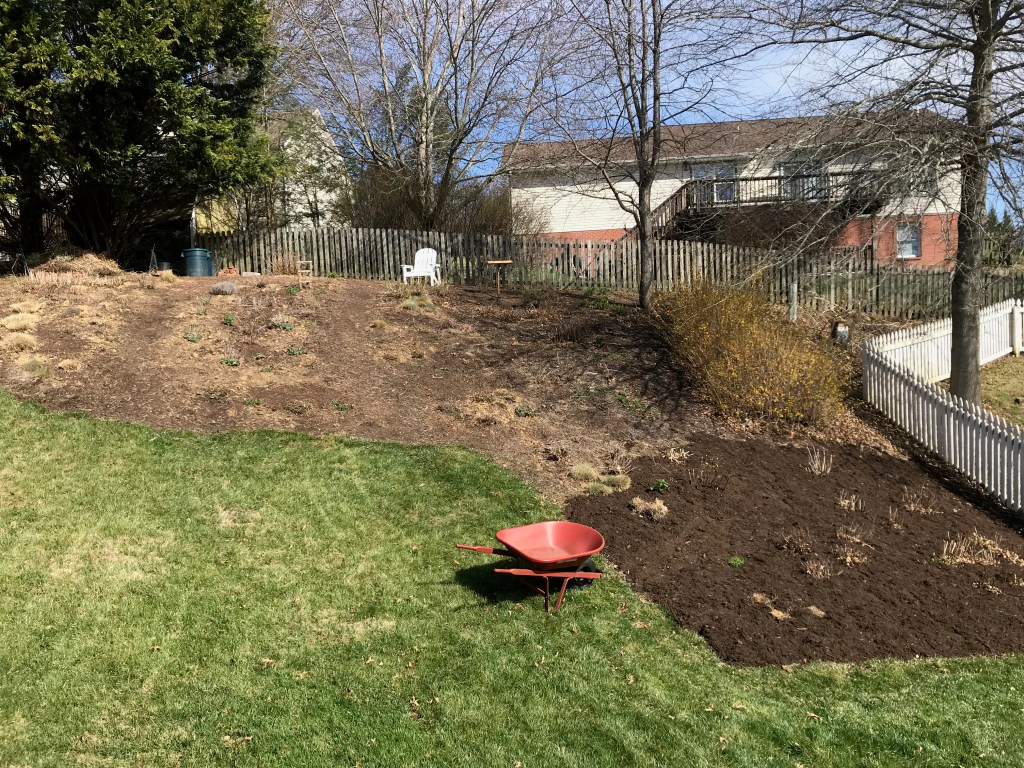After getting all of that done, I was able to rest on Wednesday — a cold, windy day. I took it easier most of the rest of the week, taking on various odds and ends before tackling the mulch on the back hill: