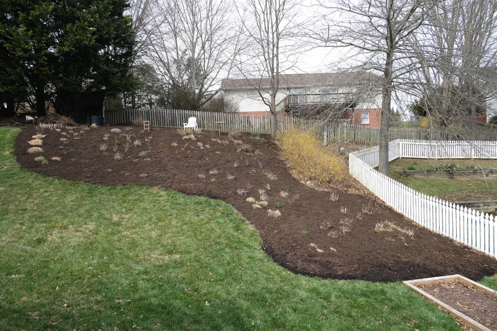 As the mulch pile shrank, we realized we were going to come up short. I ordered 12 cubic yards, and I spread the final wheelbarrow full still having several small areas that need mulching. I should have ordered 14 or 15 yards and saved any leftovers for filling in throughout the summer. Next year!